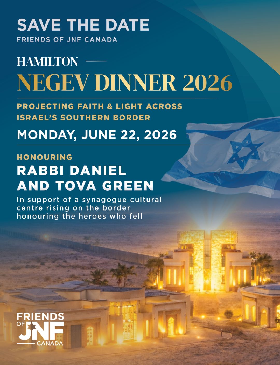 Please join us for an inspiring evening with our Negev Dinner honourees, Hamilton’s very own Rabbi Daniel and Tova Green.