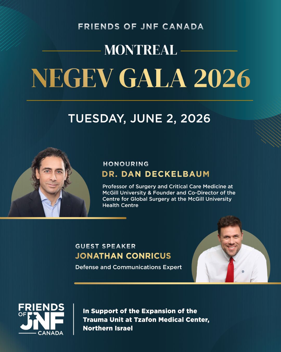 Friends of JNF Canada, Montreal cordially invites you to the Negev Gala 2026, an exceptional evening of impact and inspiration. This year, we are proud to honour Dr. Dan Deckelbaum, Professor of Surgery and Critical Care Medicine at McGill University, and Founder and Co-Director of the Centre for Global Surgery at the McGill University Health Centre, a world-renowned leader advancing trauma care on a global scale.